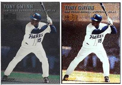First up, the Metal Universe card from 1998. The original flatbed scan is on the left.
